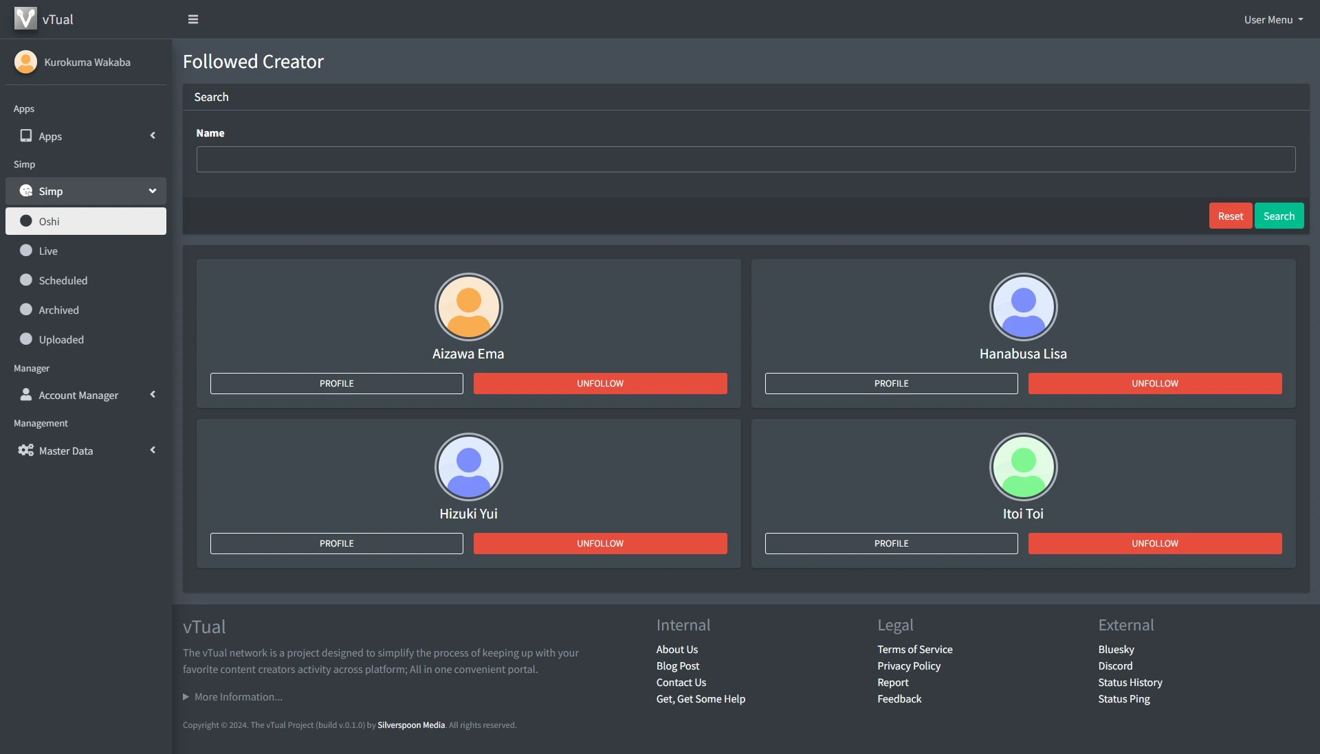 To help you manage your list of Oshis, you can access the "Oshi" menu. Here you can search, view their profiles, and even unfollow them if you choose.